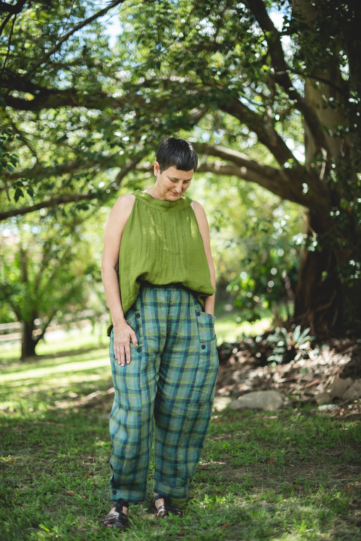 The Whatever Pants are offered in a classic range our mid-weight linens along with our recommended specialty linens.  Seen here in our model Kerry in Navy and Red Gingham Linen and Navy linen.  Kerry is 170cm tall and wears a regular size 14.
