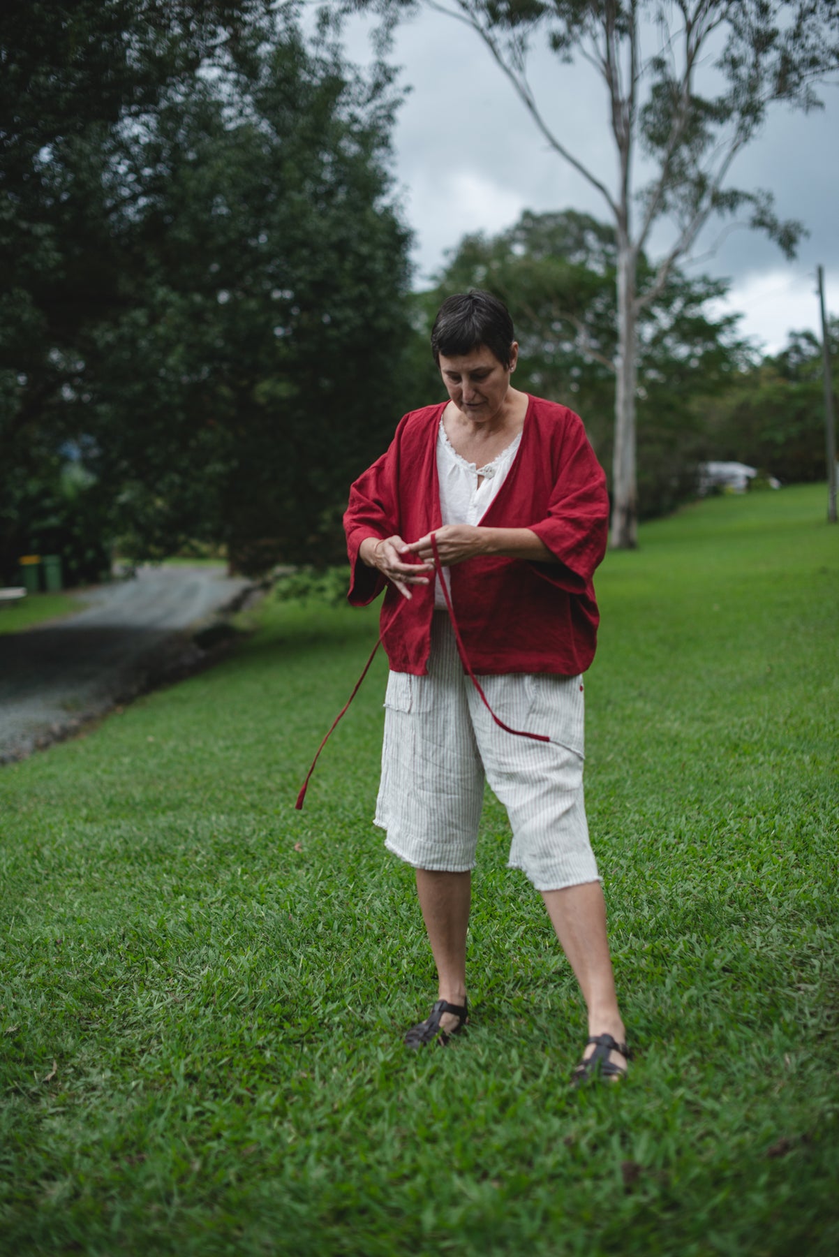 Seen here on Kerry in Crimson styled with the Chemise singlet in milk and Stickler Shorts